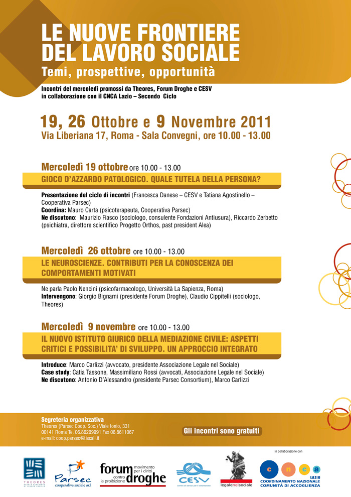 Il lavoro sociale, mai come in questo momento storico, è chiamato a ripensare se stesso e ritrovare ragioni, prospettive e strumenti. La crisi che attraversa l'occidente, solo in parte crisi dell'economia, costringe ad uscire dai consueti campi d'azione e deve motivare un'inedita esplorazione dei bisogni e delle opportunità che la scienza e la realtà sociale ci pongono di fronte. Il secondo ciclo degli incontri del mercoledì intende mettere a tema il fenomeno del gioco d'azzardo, "sogno" che tende a coinvolgere sino alla patologia persone in difficoltà economica e di progettualità, e il nuovo istituto della mediazione civile che, nonostante alcuni elementi di criticità, apre nuove ed interessanti ipotesi di lavoro, soprattutto se pensato in una prospettiva integrata. Inoltre, torneremo a parlare di neuroscienze, e del contributo che possono offrire alla comprensione dei comportamenti motivati.